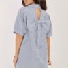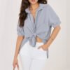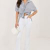 Women’s striped shirt is a stylish proposal combining casual comfort with elegant accents. It will work great both for everyday wear, for work, and for more formal occasions. The classic striped pattern gives it a timeless character and makes it easy to match with different stylizations. The buttoned model with a collar and short sleeve stands out with a modern cut, the back is slightly elongated, adding lightness and freedom to the silhouette. The puffy sleeve adds a fashionable, feminine touch to the whole. A unique element is the eye-catching cut on the back decorated with a bow, which attracts attention and gives the shirt an original, subtly sensual character. Made of a pleasant to the touch blend of cotton and elastane, it provides comfort and freedom of movement. This is the perfect shirt for women who appreciate classic style in a modern, unconventional version.