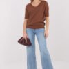 Casual women’s sweater made of a stretchy blend of viscose, polyester, and polyamide, which provides comfort and lightness when worn. The V-neckline gives the silhouette a subtle elegance, and the short sleeves make the sweater perfect for everyday styling and work. The varied texture of the material adds an interesting character to the whole, and the standard length allows for easy pairing with various pants and skirts. A model without fastening, simple and universal, perfect for casual and business outfits.