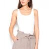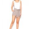 Shorts with ruffled waistband and tied sash. Pockets in side seams. Shorts have wide, loose legs.
