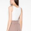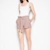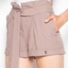 Short shorts with legs finished with a cuff. High waist finished with a frill, tied with a belt, pockets in side seams.