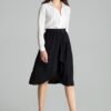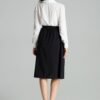Black midi skirt with a pleated waist and a covered side zip fastening. Envelope skirt front. At the front a belt with a decorative metal buckle in gold. Dress unlined and without pockets.