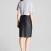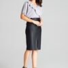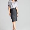 Black eco-leather midi pencil skirt. Fastened at the front with a decorative clasp and at the back with a covered zip. No pockets and no lining. A delicate slit in the middle at the front.