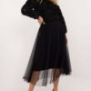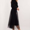 A midi length flared tulle skirt, perfect for everyday wear and events, combining casual style with a touch of elegance. Made of lightweight polyester, the skirt features a smooth pattern that gives it a subtle and versatile feel. The tulle material combined with the flared cut creates a light and airy effect, perfect for a variety of occasions. The elastic waistband provides a comfortable fit, making the skirt not only stylish, but also comfortable. The lining underneath the tulle adds additional comfort to the wearer, so the skirt fits well and works well for everyday and more formal outfits.