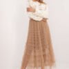 An elegant tulle skirt with ruffles is a stylish proposal for everyday outings, work, as well as special occasions or parties. Made of lightweight polyester, it has a smooth pattern and a midi length, giving it a feminine and elegant look. Delicate ruffles add a romantic character to the skirt and emphasize its elegant style. The lack of closure and an elastic waistband ensure comfortable wear, while the lining guarantees comfort and prevents see-through. This unique skirt combines subtle elegance with practicality, perfect for various occasions.