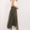 A midi length flared tulle skirt, perfect for everyday wear and events, combining casual style with a touch of elegance. Made of lightweight polyester, the skirt features a smooth pattern that gives it a subtle and versatile feel. The tulle material combined with the flared cut creates a light and airy effect, perfect for a variety of occasions. The elastic waistband provides a comfortable fit, making the skirt not only stylish, but also comfortable. The lining underneath the tulle adds additional comfort to the wearer, so the skirt fits well and works well for everyday and more formal outfits.