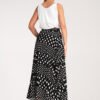 Pleated midi skirt, decorated with a white polka dot pattern. High-waisted model with subtle pleats and a stylish belt with a buckle, emphasizing the waist.