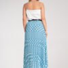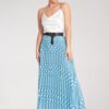 Pleated midi skirt, decorated with a white polka dot pattern. The model has a high waist, subtle pleats, and a stylish belt with a buckle, emphasizing the waist.
