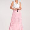 Pleated midi skirt, decorated with a pattern of white polka dots. The model has a high waist, subtle pleats, and a stylish belt with a buckle, emphasizing the waist.