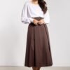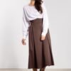 The classic midi skirt with a high waist beautifully emphasizes the waist and optically elongates the silhouette. The wide belt with a tie at the back adds a feminine character, and the flared bottom falls lightly and freely, providing comfort when worn. The knee-length makes the skirt versatile, perfect for both everyday styling and elegant combinations. The minimalist cut offers many combination possibilities, from classic shirts to loose sweaters and tops.
