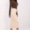 An elegant knitted skirt made of ribbed material that beautifully fits the silhouette and emphasizes feminine shapes. Thanks to the high-quality blend of viscose and polyester, the model is soft, elastic, and very comfortable to wear. The skirt has a midi length, giving it a classy character and making it perfect for formal occasions, work, and everyday wear. A waistband with elastic has been sewn in, providing a perfect fit and comfort throughout the day. Additionally, the model is equipped with a fastened belt that accentuates the waist and adds elegance to the styling. At the back, at the bottom, there is a subtle slit that increases freedom of movement and adds lightness to the skirt. The lack of a traditional fastening makes it extremely comfortable and easy to put on. This is a universal proposition for women who appreciate elegance, comfort, and timeless style.