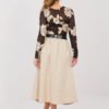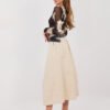 This flared midi skirt is a perfect choice for women who appreciate elegance combined with comfort. The classic cut beautifully fits the silhouette, emphasizing the waist and adding lightness to every move. An elastic waistband ensures a comfortable fit without the need for fastening. Decorative pleats at the front give the skirt a unique character and subtle volume, while the textured fabric and delicate floral pattern introduce a touch of feminine elegance. The model will work perfectly in both formal stylizations and for work with a shirt, blouse, or blazer. Additional advantages are practical, slip pockets and a fastening belt that allows you to highlight the waist and give the whole a refined look. This is a skirt that combines classic elegance with everyday comfort. Ideal for the office, meetings, and special occasions whenever you want to look stylish and feel comfortable.