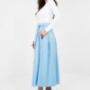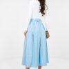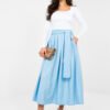 An elegant midi skirt with a flared cut is a perfect choice for women who appreciate classic style with a touch of modernity. The high-waisted model beautifully accentuates the waist, while the elastic waistband ensures a perfect fit and comfort throughout the day. The skirt is made of striped material, which adds a stylish character and visually slims the silhouette. The attached tie belt allows you to further accentuate the waist and give the outfit an individual expression. Practical slip pockets increase the functionality of the model. Made of a blend of polyester, viscose, and elastane, it combines durability with softness and elasticity, guaranteeing comfort and an elegant look in both office and special occasion outfits.