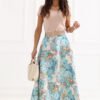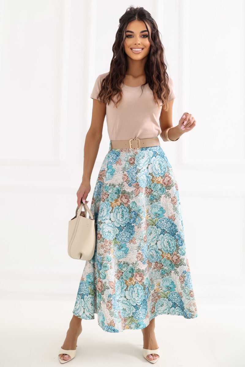 Stylish midi skirt with an elegant yet versatile character. Perfect for styling for work, business meetings, and everyday wear. The model stands out with a trendy floral print that adds lightness and feminine charm. Made of high-quality polyester blend with elastane, it provides comfort and freedom of movement. The skirt has no classic fastening, an elastic band is sewn at the back of the waist, which adapts to the silhouette and guarantees comfort throughout the day. An additional element is the fastened belt, which accentuates the waist and gives the whole an elegant finish. The midi length makes the model look extremely stylish and suitable for many occasions. Ideal to pair with both a shirt and a blazer, as well as with a light top or sweater.