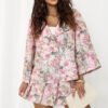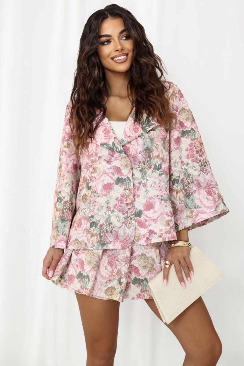 Elegant skirt shorts with a subtle, floral print, perfect for work outfits and formal occasions. Combining the feminine look of a skirt with the comfort of shorts, providing freedom of movement and a stylish effect. Made of high-quality polyester and elastane blend, ensuring comfort and a good fit to the silhouette. The wide legs add lightness and elegance, beautifully draping during movement. The model features an elastic waistband at the back for increased comfort and easy adjustment. Additionally, the buckle belt highlights the waist and adds a stylish accent. The front features a striking skirt insert with pleats, giving the whole outfit a unique, feminine character.