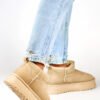 Beige women’s snow boots for the autumn/winter season, made of high-quality natural leather, are the perfect choice for women who want to combine comfort with a fashionable look on cold days. The 10 cm high upper provides adequate protection from the cold and snow, and the minimalist design makes it easy to match the snow boots with a variety of styles. The interior of the shoes is lined with pleasant eco-fur, which effectively insulates the feet, guaranteeing comfort while wearing. The slip-on cut makes it easy to put on and take off, which is especially practical for everyday use. The round toe adds a classic touch to the shoes, while providing comfort for the toes. The 5 cm high platform provides excellent stability and cushioning, making these snow boots an ideal choice for long walks on winter streets. The beige snow boots are a combination of elegance and functionality that will work in all weather conditions.