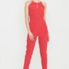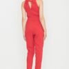 Jumpsuit with long tapered legs. Not too deep, half-round neckline with a slit decorated with a metal chain which makes it look chic and elegant. It fits well, emphasizes the silhouette and slenderizes it optically. Discreet zipper at back. A fashionable proposition for many occasions.