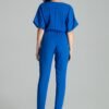 Sapphire jumpsuit with long straight pants and short kimono sleeves ending in a cuff. Waist cut off with sewn-in elastic band. Envelope neckline. Suits without pockets.