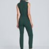 Green, sleeveless, tie waist, loose-fitting v-neck jumpsuit with collar, tapered legs. Fastened at the front waist with one external and one internal snap and a covered zip. Pockets at side seams.