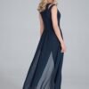 Jumpsuit with long chiffon skirt slit at the back. Sleeveless, with decorative slits at the shoulders and a small semi-circular neckline. The legs are tapered at the bottom. Fastened at the back with a long covered zip.
