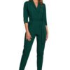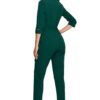 This jumpsuit has more than one face. Top with envelope neckline and shawl collar, 7/8 length sleeves with decorative cracks, waist tie and slim legs pressed at the hem, it’s an office chic or a going out craze. The suit is unlined.