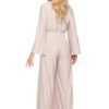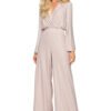 A one-piece, jumpsuit with brocade trim has more than one advantage. It is elegant, thanks to its wide legs and sleeves and overlap neckline with delicate draping, and it is also practical and comfortable. The material shimmers beautifully in the light and looks lovely as you move around.
