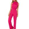 Elegant pantsuit with a halter neckline and a striking tie around the neck. The suit is fastened with a covered zipper, with slip pockets on the sides.