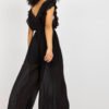 Pleated jumpsuit with wide legs, v-neckline and waist tie. The jumpsuit has a lining.