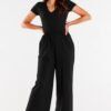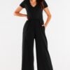 Wide-legged jumpsuit made of very pleasant and soft knit fabric. Top with short sleeves and a heart neckline. Crinkled with elastic at the waist. Designed and sewn in Poland.