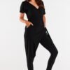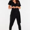 Jumpsuit with tight legs and an envelope top. Crinkled with a wide elastic waistband. It has an asymmetrical binding at the front and pockets. Designed and sewn in Poland.