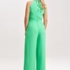 Sleeveless jumpsuit with long, wide legs, tied at the neck. Not too deep, semicircular neckline with a slit. Zipper closure at the back. The jumpsuit has slip pockets.