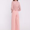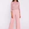 Elegant jumpsuit made of smooth fabric with a lace top is a unique combination of classic and chic. The top made of delicate lace gives it a romantic touch, while the short lace sleeves add lightness and subtle femininity. The wide legs optically elongate the silhouette and ensure freedom of movement, creating an effect of refined elegance. A covered zipper at the back guarantees comfortable putting on and a perfect fit. The suit was designed and sewn in Poland, which ensures high quality workmanship and attention to every detail. Perfect for special occasions when you want to stand out with an original style.