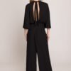 Elegant and sophisticated jumpsuit that combines style and comfort in perfect harmony. The top is delicately pleated, with wide kimono sleeves, giving it lightness and subtle volume. The stand-up collar with long scarves tied at the back allows for adjustment of the fit, and the slit on the back can be opened or closed as desired, adjusting it to your own preferences. Wide, loosely falling legs add elegance and freedom of movement, while side pockets provide functionality. The model fastens with a hidden zipper at the back, emphasizing its aesthetic finish. Designed and sewn in Poland, with the highest attention to detail. Perfect for special occasions and stylish outings. The length in the table refers to the length of the leg.