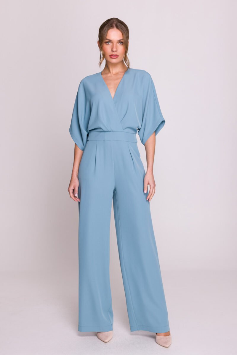 Stylish and elegant women’s jumpsuit that combines comfort with a feminine cut. The top in a wrap style with subtle pleats beautifully drapes on the silhouette, and the V-neck adds lightness and emphasizes the neckline. Short sleeves provide comfort and freedom of movement. Slightly flared pants give the whole a harmonious proportion, and side pockets add a practical character. The model is fastened with a covered zipper at the back, making it look aesthetic and elegant. The jumpsuit is designed and made in Poland, with attention to detail. An ideal choice for everyday wear, work, or special occasions.