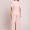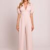 Stylish jumpsuit with a feminine cut, made of high-quality fabric. The deep V-neck beautifully accentuates the neck and cleavage, while the emphasized waist highlights the silhouette. Short puffy sleeves with cuffs add a romantic touch, and slightly flared pants with pleats from the waist provide an elegant and casual look. The model fastens with a concealed zipper at the back, with the top on a lining for greater comfort when wearing. The whole designed and made in Poland with attention to every detail.