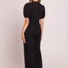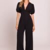 Stylish jumpsuit with a feminine cut, made of high-quality fabric. The deep V-neck beautifully accentuates the neck and décolletage, while the emphasized waist highlights the silhouette. Short puffed sleeves with cuffs add a romantic touch, and slightly widened pants with pleats from the waist provide an elegant and casual look. The model is fastened with a concealed zipper at the back, with the top lined for greater comfort. The whole outfit is designed and sewn in Poland with attention to every detail.
