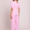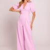Stylish jumpsuit with a feminine cut, made of high quality fabric. The deep V-neck beautifully exposes the neck and neckline, while the accentuated waist emphasizes the silhouette. Short puff sleeves with cuffs add a romantic touch, and slightly widened legs with pleats from the waist provide an elegant and casual look. The model is fastened with a concealed zipper at the back, with the top lined for greater comfort when wearing. The whole design and sewing process is done in Poland with attention to every detail.
