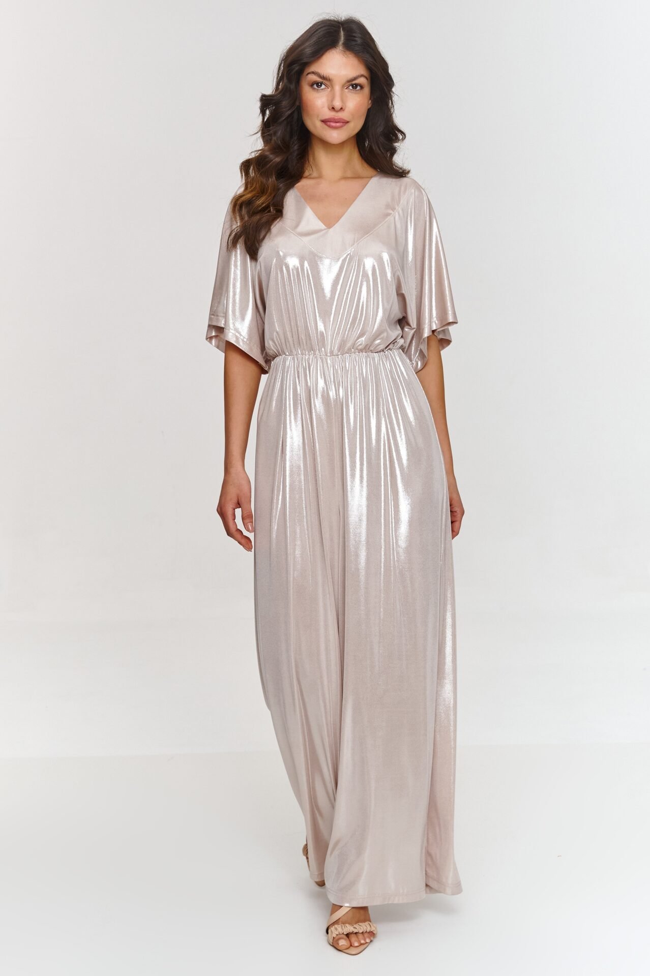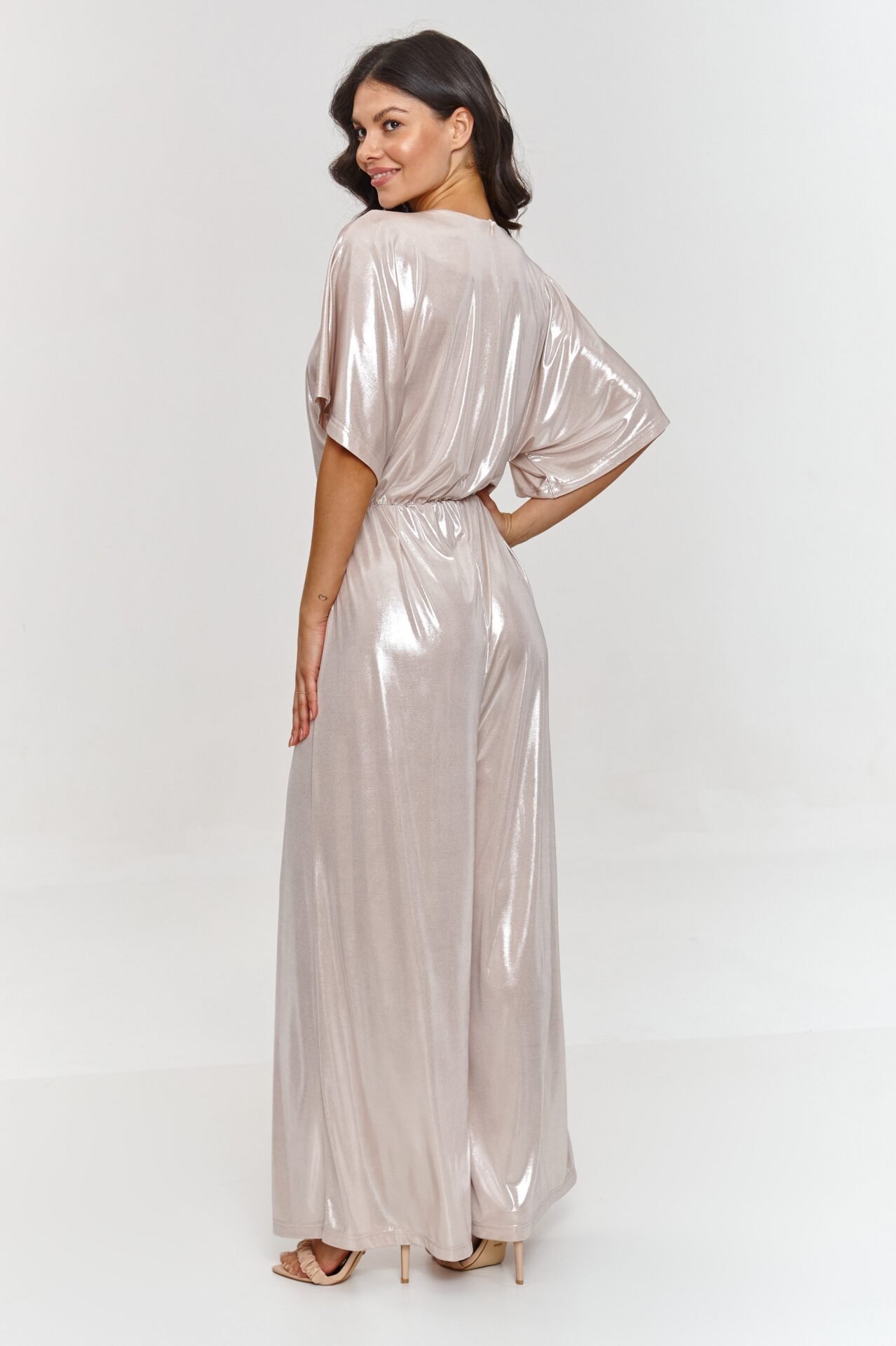 This jumpsuit is a combination of elegance and comfort, which will definitely attract attention at any special occasion. The loose top with kimono-style sleeves adds lightness and freedom to it. This detail makes the outfit look exceptionally stylish, while not restricting movement. The V-neck is subtle and elegant, perfectly highlighting the neck and shoulders. This neckline adds sensuality and emphasizes the feminine silhouette, maintaining a classic, sophisticated look. The wide-legged trousers give the jumpsuit lightness while masking figure imperfections and allowing to elongate the silhouette. The elastic waistband guarantees a perfect fit and emphasizes the figure, creating a waist-cinching effect. Thanks to this, the jumpsuit not only looks stylish, but also feels comfortable throughout the day or evening. The model is made of delicate material with a metallic finish, giving the outfit a unique shine and modern character. A metallic jumpsuit with a V-neck is a proposal that will make you stand out from the crowd. Its modern cut and shiny material will make you feel confident and stylish at any party. It is a perfect alternative to a dress, guaranteeing comfort and a unique look.