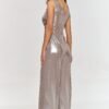 We present an elegant jumpsuit made of metallic material, thanks to which we gain a spectacular and modern look. The deep neckline emphasizes the shoulders and neck, adding sensuality and elegance to the styling, while the narrow straps give the whole outfit a universal character. The top is fitted, cut at the waist with a wide belt that perfectly accentuates the silhouette, creating the effect of a slimmer figure. The wide, straight legs give it lightness and class, making it a modern choice that attracts attention and allows you to feel stylish and confident. Additionally, there is a subtle cutout at the back, finished with a zipper to make it easier to put on. Our metallic jumpsuit is a perfect choice for evening outings, special events, and stylish banquets. Thanks to its modern construction, it will not only provide you with comfort throughout the evening but also a dazzling look that will attract all eyes. Pair it with elegant heels and jewelry to create a unique styling.