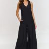 Stylish jumpsuit is a great proposition for women looking for a fashionable outfit. The model has a subtle V-neckline, which gives it an elegant and feminine look and additionally emphasizes the silhouette and visually elongates the neck, adding class and lightness. Wide legs and loose fit make the jumpsuit very comfortable and at the same time original. The model is fastened with a zipper, which makes it easier to put on, while the side pockets are a practical addition. An additional advantage is the pleasant to the touch and breathable material, making it an excellent choice for warm days. Thanks to its simple yet elegant design, the jumpsuit is suitable for both everyday outings and more formal occasions, such as meetings or evening events. It can be paired with white sneakers for everyday wear or with heels for more elegant events.