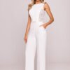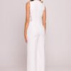 Unique jumpsuit that combines classic elegance with subtle sensuality. Made of smooth, pleasant to the touch fabric, enriched on the sides with geometric, lace panels that beautifully shape the silhouette and add lightness to the whole. The fitted top with a high, round neckline and sleeveless contrasts with wide, long legs pressed on the crease, creating an elegant, visually lengthening silhouette. The waist is emphasized by a metal decoration at the front, which is a minimalist but striking detail. The concealed zipper at the back ensures easy dressing, and the lack of pockets emphasizes the purity of the form. The jumpsuit will work perfectly for ceremonies, evening outings, or formal meetings. Designed and sewn in Poland, with attention to quality and details. Lace 90% nylon, 5% elastane.
