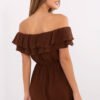 Light and airy muslin jumpsuit is an ideal choice for summer, everyday stylizations. Made of natural cotton, it guarantees comfort and convenience even on hot days. The short sleeveless cut beautifully exposes the legs and arms, and the off-the-shoulder neckline with a decorative ruffle adds a feminine charm and summer casualness. There is an elastic band at the waist, which subtly emphasizes the waist and ensures a perfect fit to the silhouette. The model has no fastening, which makes it exceptionally comfortable and easy to put on. Smooth material combined with a simple form makes it a versatile choice for everyday wear, perfect for a walk, beach, or during holiday trips.