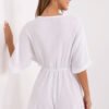 Light and airy muslin jumpsuit is the perfect choice for everyday, summer stylizations. Made of natural, breathable cotton, it guarantees comfort throughout the day even on hot days. The model is short in length, with short sleeves and a wrap neckline that subtly accentuates the neckline and decolletage. An elastic band at the waist allows the jumpsuit to adjust to the silhouette and emphasize its proportions. The lack of fastening makes it quick and comfortable to put on. The smooth texture of the fabric and simple cut make it a versatile wardrobe element, perfect for a walk, shopping, or a summer meeting with friends.