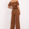 Stylish and feminine jumpsuit with a smooth finish is a universal proposal for many occasions, it will work both for everyday wear, for work, and for more formal outings. Made of a pleasant to the touch blend of viscose, polyester and elastane, it provides comfort and freedom of movement. The sleeveless model, with an impressive Spanish neckline adorned with a ruffle, subtly emphasizes the shoulders and adds a romantic character to the whole. An elastic band sewn into the waist adjusts to the silhouette and beautifully emphasizes it. Long, loosely falling legs give the jumpsuit elegance, and side slip pockets increase its functionality. The model does not have a fastening, it is put on over the head.