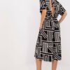 Stylish jumpsuit with a geometric pattern is an ideal proposition for everyday wear, work, and also for formal occasions. Made of lightweight, breathable fabric with a touch of elastane, it provides comfort and freedom of movement. The model has short sleeves and a wrap neckline that subtly accentuates the neckline. Tying at the neck adds elegance, and the belt at the waist allows for an optical slimming effect. Culotte-style trousers that reach below the knee create a trendy, modern silhouette. An additional advantage are the practical, side pockets. This is a feminine and functional choice for various occasions.