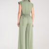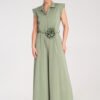 Jumpsuit with a collar and button fastening, with slightly elongated shoulder line ending with short tabs. Thin belt with a decorative flower made of the same material at the waist. Wide and long, freely falling trousers.