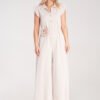 Overall, the jumpsuit has a collar and button fastening, with slightly elongated shoulder lines ending in short tabs. At the waist, there is a thin belt with a decorative flower made of the same material. The trousers are wide and long, falling loosely.