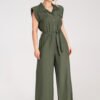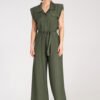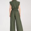 Jumpsuit with wide legs, made of light and breathable material. Top buttoned up, with a collar and decorative flaps on the chest. Sleeveless model, with slightly widened and padded shoulders and a tied belt at the waist.