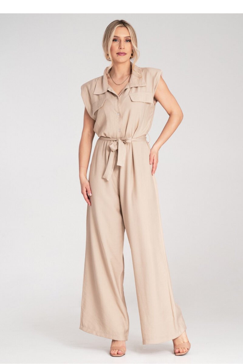 Jumpsuit with wide legs, made of light and breathable material. Top fastened with buttons, with a collar and decorative flaps on the chest. Sleeveless model, with slightly widened and padded shoulders and a tied belt at the waist.