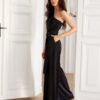 Isotta is a refined jumpsuit with a minimalist cut that delights with eye-catching details and modern elegance. Made of soft, fluidly draping material, it combines classic simplicity with a bold approach to form. The asymmetrical one-shoulder neckline subtly highlights the neck and shoulders, adding lightness to the silhouette. The back with open back attracts attention with a decorative fabric intertwining, creating an unusual, sensual accent. The lack of sleeves is balanced by long, flared trousers that visually elongate the legs and guarantee comfort. At the waist, there is a wide belt with a gold buckle that emphasizes the feminine silhouette and complements the elegant character of the design. Isotta is a proposal for women looking for a modern alternative to a sensual, refined, and classy dress. Perfect for special occasions: evening outings, elegant dinners, or formal events. Every element has been carefully designed and made in Poland, with attention to detail and the highest quality.