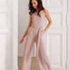 Isotta is a refined jumpsuit with a minimalist cut that impresses with its striking details and modern elegance. Made of soft, flowing material, it combines classic simplicity with a bold approach to form. The asymmetrical one-shoulder neckline subtly accentuates the neck and shoulders, adding lightness to the silhouette. The back with open shoulders attracts attention with a decorative interweaving of fabric, creating a unique, sensual accent. The lack of sleeves is balanced by long, flared legs that visually lengthen the legs and guarantee comfort when wearing. At the waist, there is a wide belt with a gold buckle that emphasizes the feminine silhouette and complements the elegant character of the design. Isotta is a proposal for women looking for a modern alternative to a sensual, refined, and classy dress. Perfect for special occasions: evening outings, elegant dinners, or formal events. Every element has been carefully designed and made in Poland, with attention to detail and the highest quality.